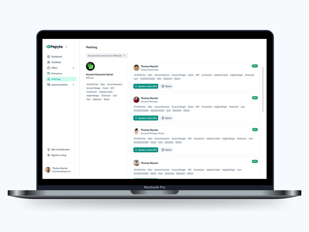 Thomas a grandement amélioré notre plateforme de recrutement. Il a su comprendre les besoins des utilisateurs. Il a également collaboré efficacement avec notre équipe de développement. Nous avons obtenu une augmentation importante de la satisfaction des utilisateurs clients et de l’efficacité des processus de recrutement.
