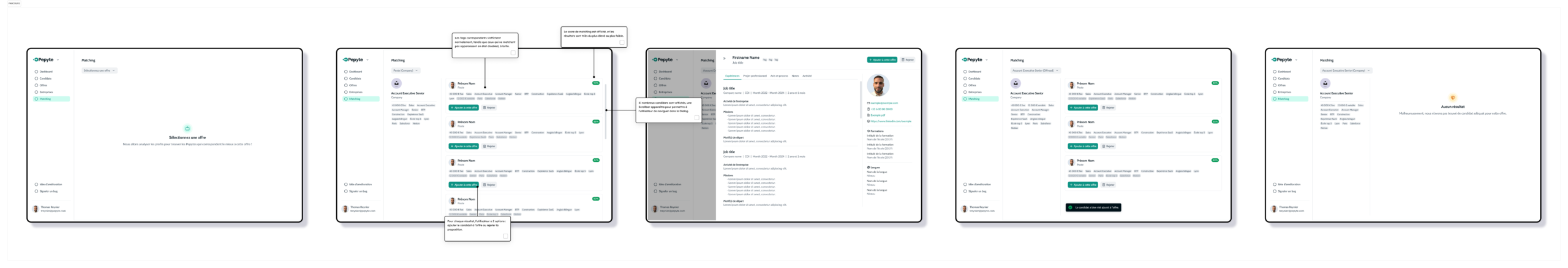 Je mène des entretiens et des ateliers pour identifier les critères de correspondance utiles aux équipes. Je formalise les règles pour les rendre claires et conçois le parcours de la fonctionnalité.