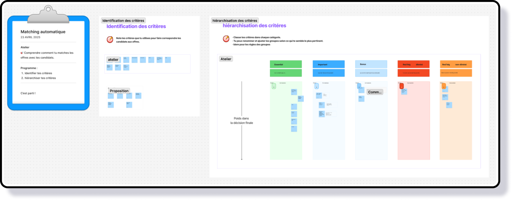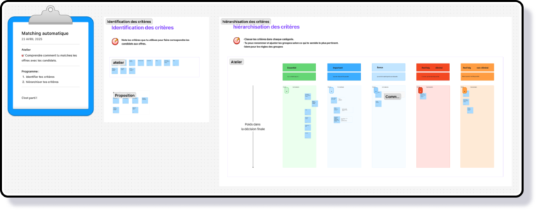 Les participants listent leurs critères de matching (séniorité, secteur, outils, rémunération, langues, missions, attentes candidats…), les regroupent en catégories ajustables.