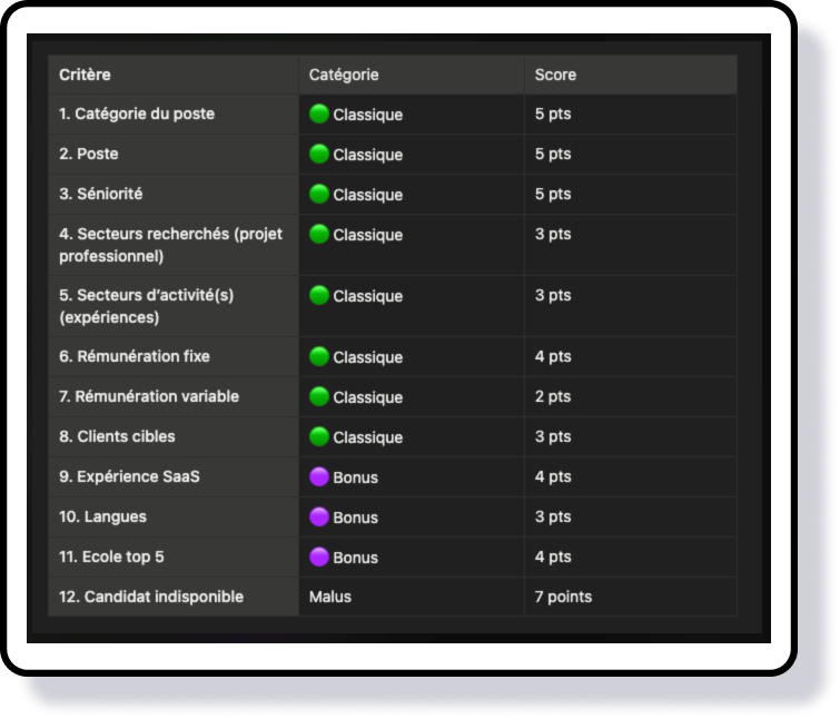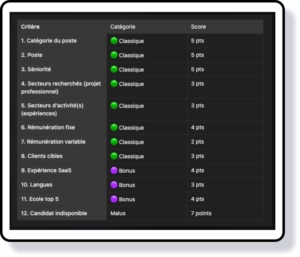 Je structure ensuite ces critères en une grille exploitable composée de critères classiques (socle du matching), bonus (différenciation) et malus (pénalisants ou bloquants), chacun pondéré par un score. Cette hiérarchisation permet de formaliser une logique de matching claire, mesurable et directement intégrable dans le produit.