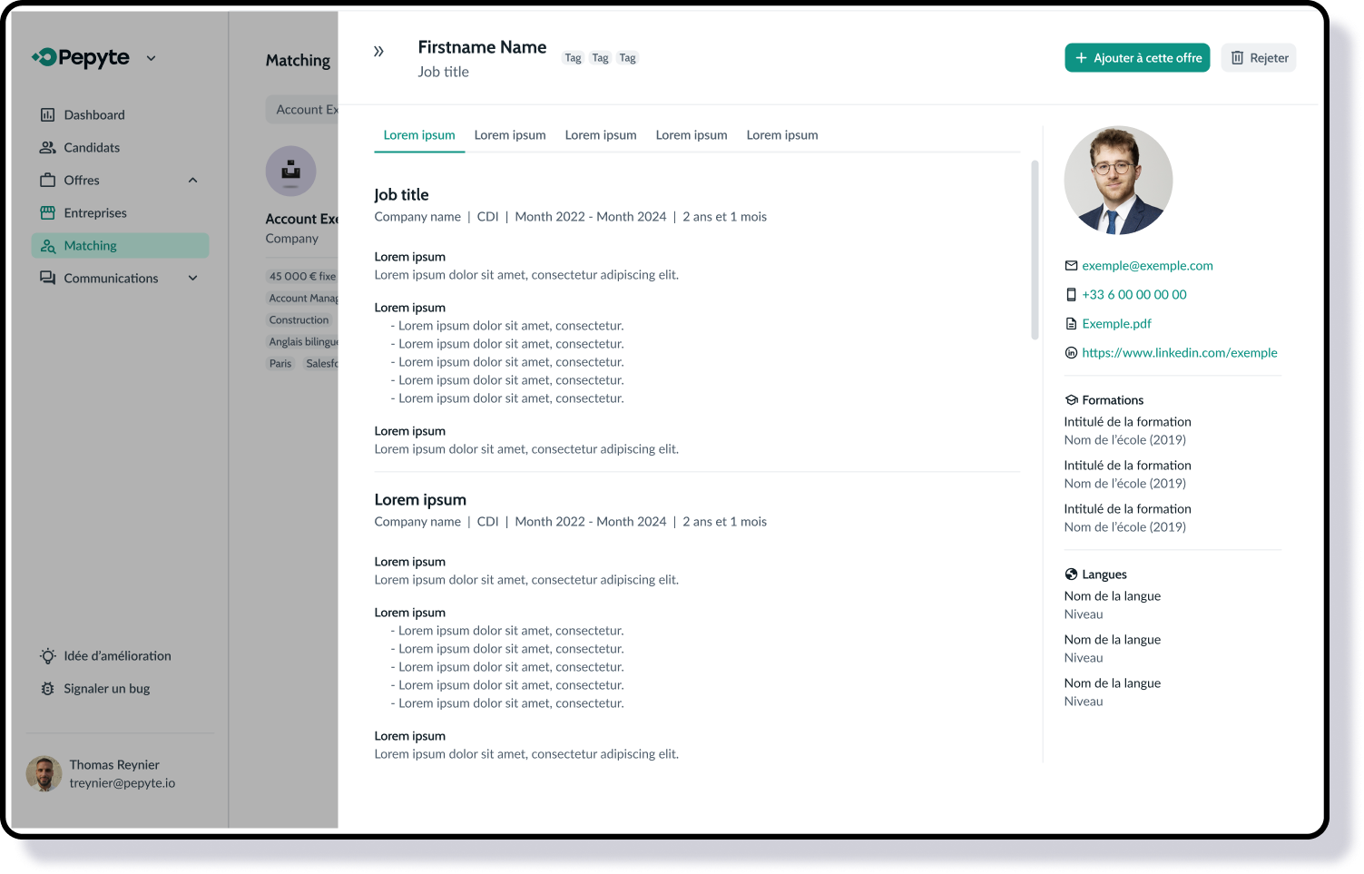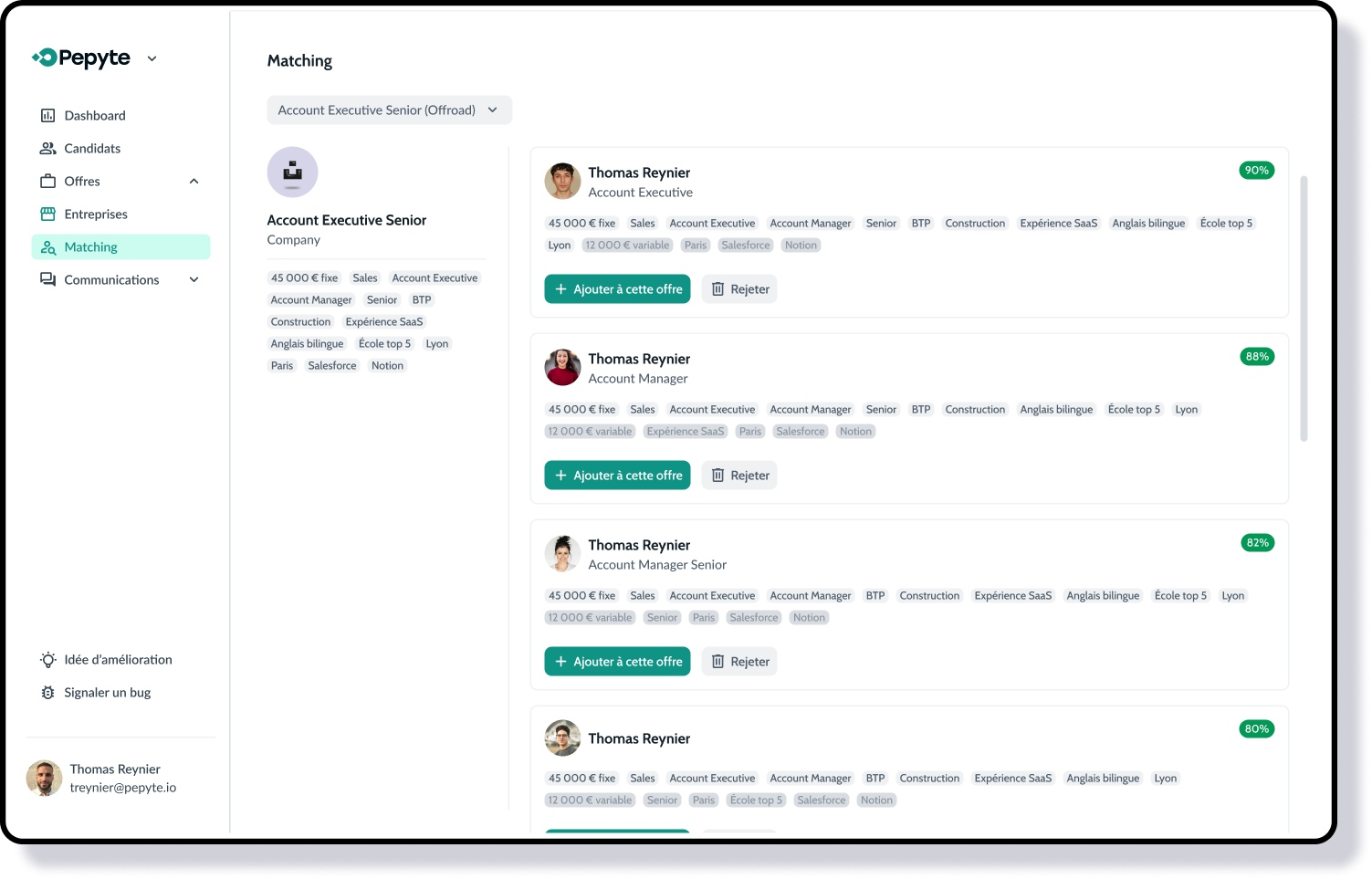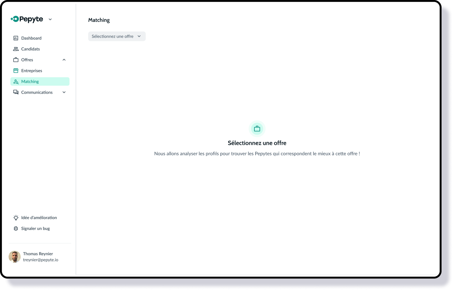 Pepyte accompagne les entreprises tech dans le recrutement et propose un outil SaaS dédié. Le matching entre les fiches offres et candidats est réalisé manuellement, dépend de l’expertise individuelle et reste difficilement scalable.
