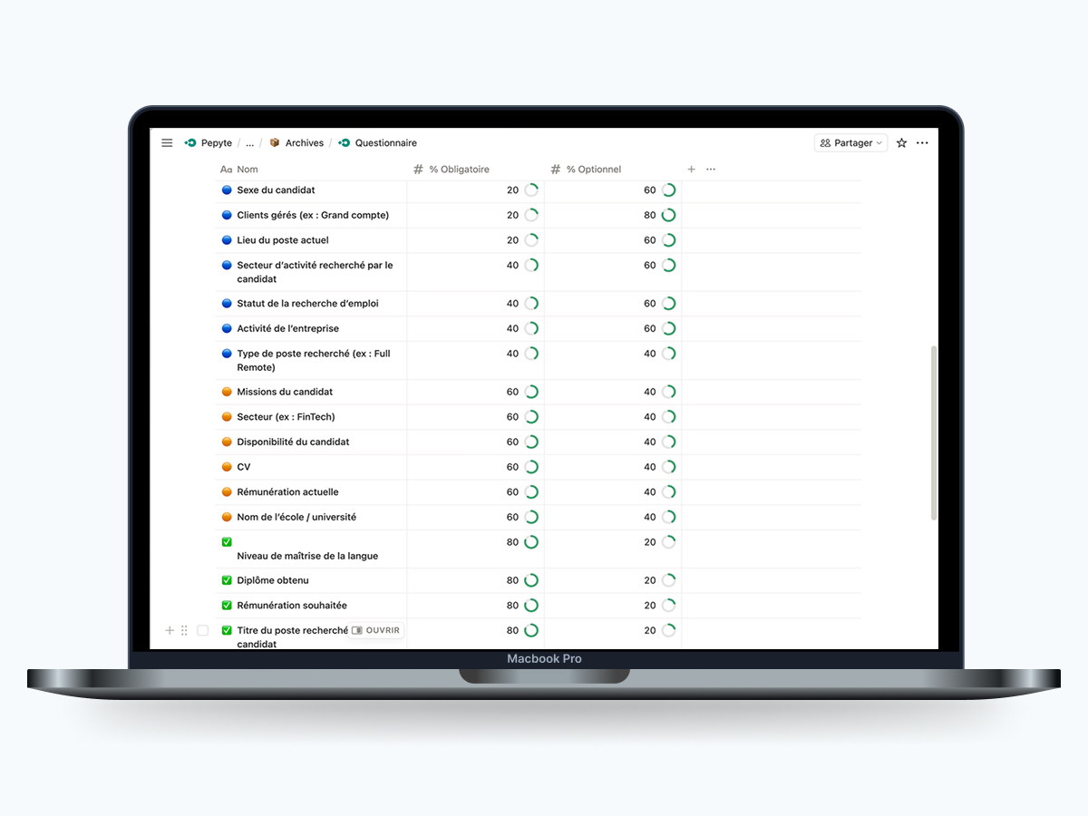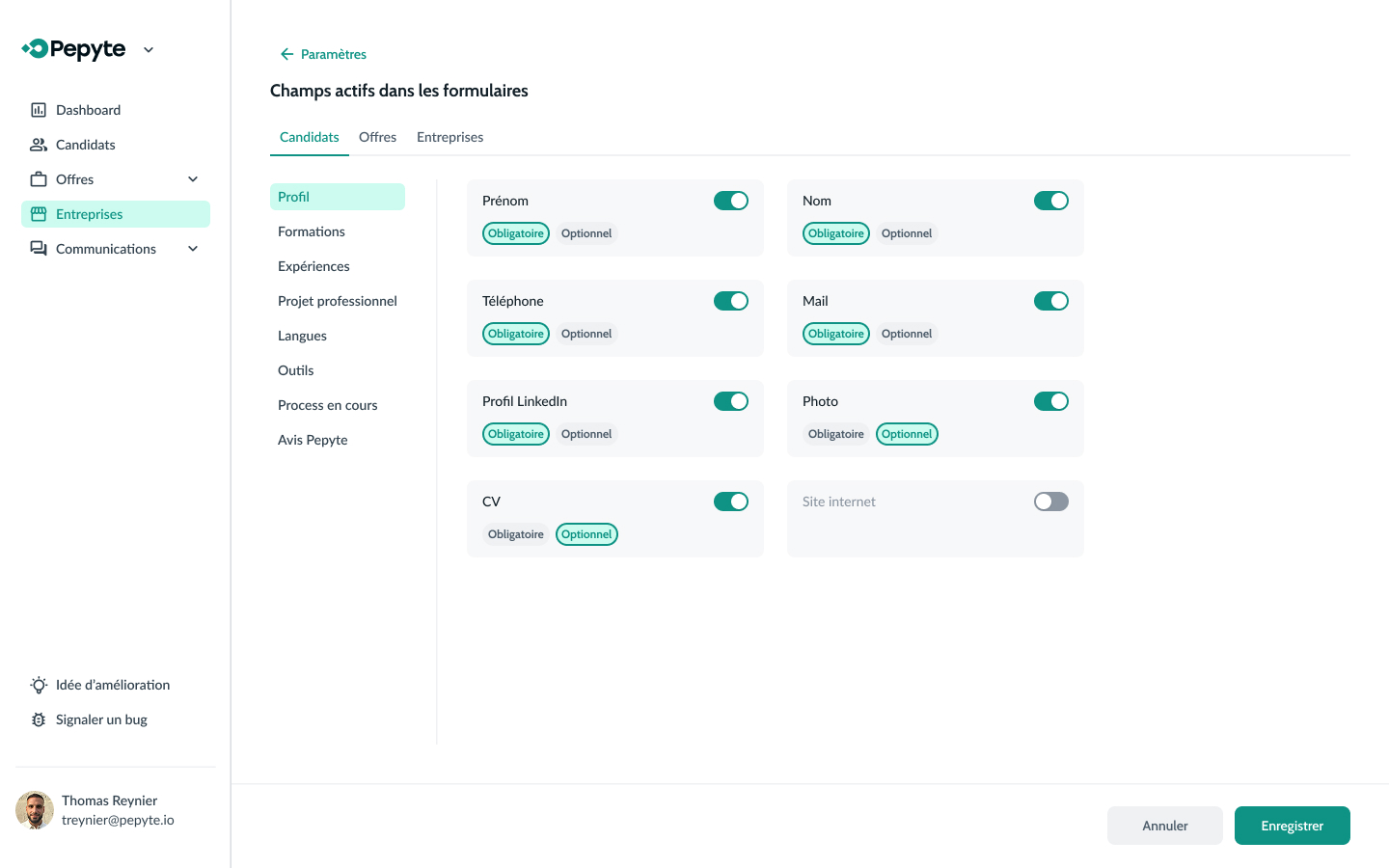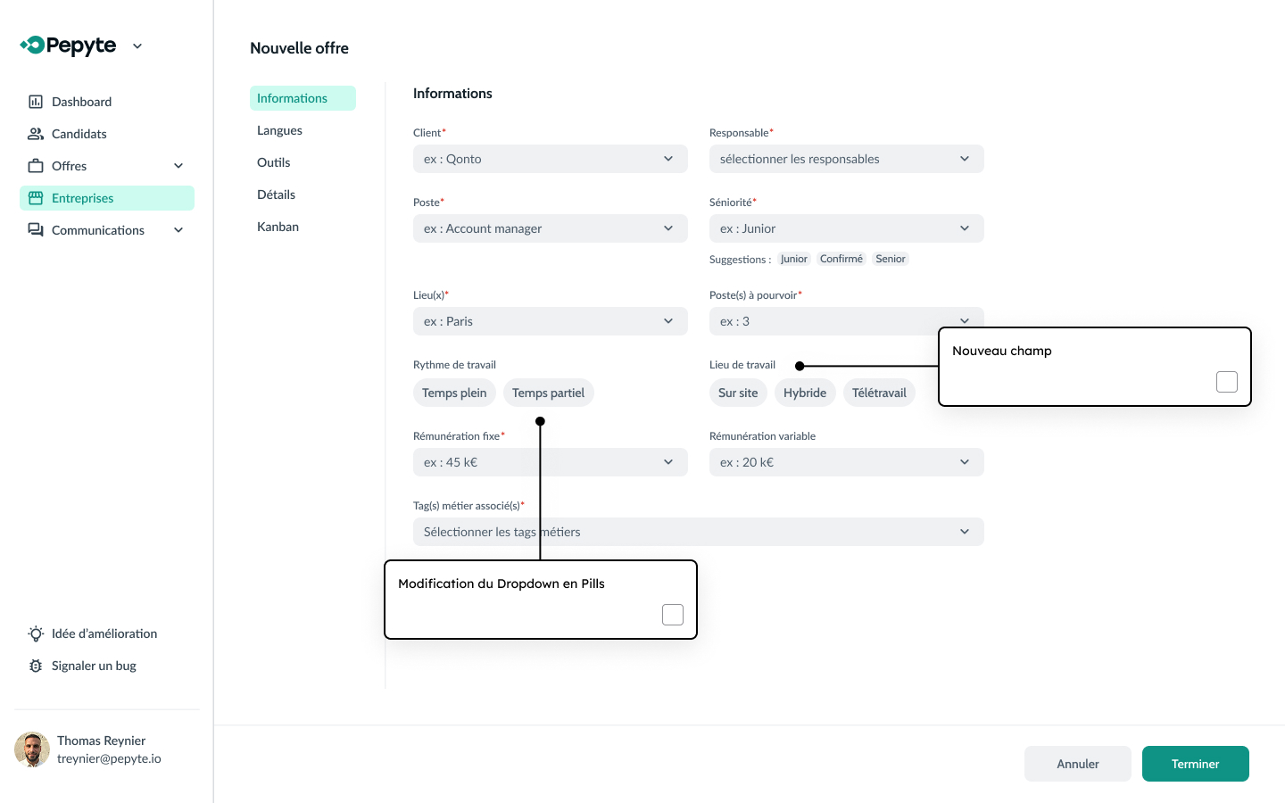 Grâce aux entretiens, aux questionnaires et aux ateliers, j’ai repensé les formulaires à partir des besoins réels des recruteurs. Cela m’a permis d’améliorer la qualité des données collectées, notamment en ajoutant de nouveaux champs utiles au matching.