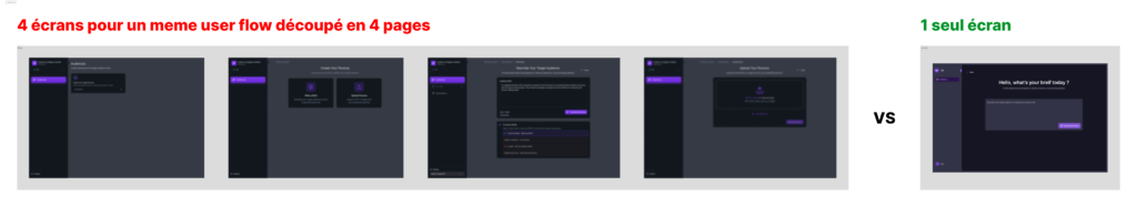 Dans cet exemple, l’action principale est la génération de résultats, à partir d’un prompt ou d’un fichier importé. Au départ, le parcours était découpé en quatre écrans successifs, ce qui ralentissait l’accès aux résultats : générer un nouveau document → choix entre prompt ou envoi de fichier → prompt (choix n°1) → envoie de fichier (choix n°2).